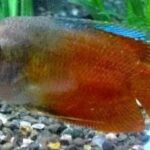 Males are red with a blue dorsal fin and unlike other color varieties these have no vertical stripes, they can reach 3.5 inches while females are grey and only reach 3 inches. When males are in the presence of a female they develop a purple chest and flare up their dorsal fins. They have a labyrinth organ that functions like a lung and allows them to breathe atmospheric air, this works as a survival mechanism for when they are in drought affected areas or polluted waters. Dwarf Gouramis are very popular in hobby and as such several color varieties were developed, like neon blue and rainbow. To keep these fish in captivity, water temperature should range from 72ºF to 82ºF and water pH should be between 6.0 and 8.0. The tank should have lots of plants and hiding places and it should be placed far from noisy areas. Dwarf Gouramis can be kept in community aquariums, however, larger and aggressive tankmates should be avoided. Males of this species shouldn’t be kept together and a pair of male/female isn’t recommended because the male may become aggressive towards the female, a group of several females to a male is recommended.