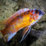 These fish have an overhanging snout, chisel-shaped teeth for grazing algae from rocks and can reach 7 inches. Males are dark blue with orange fins but can change their colors to a lighter blue when stressed or excited. To keep this species in an aquarium, the water should be well oxygenated, have a pH between 7.8 and 8.6 and temperatures ranging from 75ºF to 82ºF. The tank should have a sandy substrate, plenty of rocks, caves and open area to swim. They are very territorial and can even be aggressive towards other species. However, they can be kept in a community tank with other Mbuna. This species should never be in the same aquarium as Labeotropheus trewavasae to avoid hybridization. They are quite aggressive against their species, however, overcrowding the tank helps to dissipate the aggression.