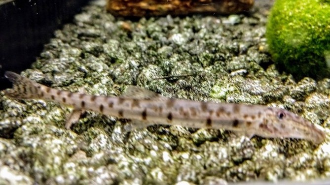 These fish have an elongated body and a long snout that bends downward between the eyes and nose. They have no scales in their head and the back and sides of the fish are brown with spots and stripes while their lower parts are white and their fins are brownish. They are usually 8 inches in the wild, however, they are usually smaller in an aquarium. To keep these fish in captivity, water pH should be between 6.0 and 6.5 and water temperature should range from 77ºF to 84ºF. The tank should have a deep, fine gravel or sandy substrate since this species likes to burrow and coarser material may hurt it, it should also have rocks, branches and hiding places. They are a peaceful species and can be kept in community aquariums, nevertheless, they can become territorial against their own so they should be kept as a single individual. A 45 gallon tank is enough for a single individual but for a group it is recommended a tank of at least 55 gallons.