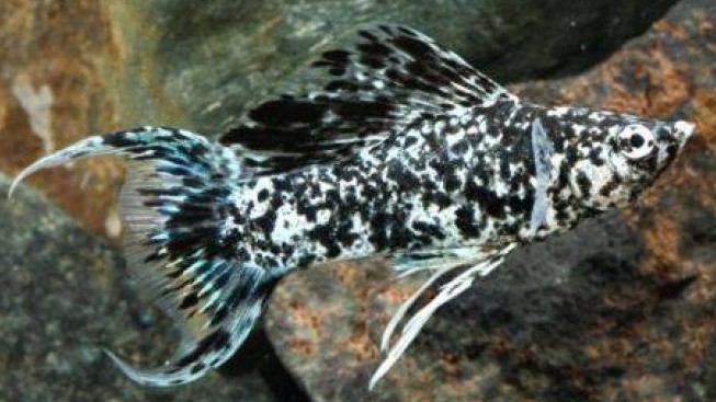 Mollies were first introduced to the hobby in 1899 and different varieties started appearing in 1920s. Poecilia sphenops is also known as the “Common Molly”, this species of Molly is the smallest of the three species, males will only reach 3 inches while females will reach 4 inches. Wild forms are blue with yellow or red fins, however, they are very popular in the hobby, and as such, many color and fin varieties have been developed. The Marble Lyretail Molly is black and white with a large tailfin with large edges. To keep these fish in captivity, water pH should be between 7.0 and 7.8 and water temperature should range from 70ºF and 82ºF. The tank should have a gravel substrate, plants and open areas for swimming. They can be kept in community aquariums with other peaceful fish, however, different molly species shouldn’t be kept together to prevent hybridization. They should be kept in groups of 3 females and one male. A 30 gallon tank is enough for a single Sailfin Molly, for a group a larger tank is needed.