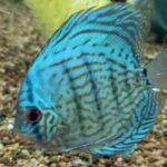 These fish are disc shaped and can reach up to 10 inches. They aren’t easy to keep so only experienced aquarists should own them. Discus fish are extremely popular in the hobby, as such, they have been highly hybridized. Nowadays there are plenty of color, pattern and shape varieties. The Neon Blue Discus has a sky blue color.