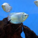 Males are blue and can reach 3.5 inches while females are grey and only reach 3 inches. When males are in the presence of a female they develop a purple chest and flare up their dorsal fins. What distinguishes the Powder Blue Dwarf Gourami from the Dwarf Gourami is that the former has no red stripes. They have a labyrinth organ that functions like a lung and allows them to breathe atmospheric air, this works as a survival mechanism for when they are in drought affected areas or polluted waters. To keep these fish in captivity, water temperature should range from 72ºF to 82ºF and water pH should be between 6.0 and 8.0. The tank should have lots of plants and hiding places and it should be placed far from noisy areas. Powder Blue Dwarf Gouramis can be kept in community aquariums, however, larger and aggressive tankmates should be avoided. Males of this species shouldn’t be kept together and a pair of male/female isn’t recommended because the male may become aggressive towards the female, a group of several females to a male is recommended.