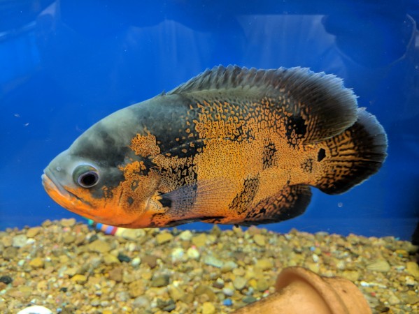 Large Cichlids, like the Red Oscar, are prone to get “Hole in the Head” disease. This disease is very common in poor water conditions and poorly fed fish. Its symptoms include cavities in the head and face.