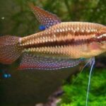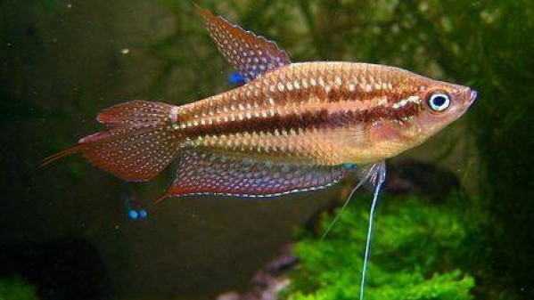 These fish are brown with small blue and green spots all over the body, their fins are blue with red markings and edges, they are very small only reaching 1.6 inches. Sparkling Gouramis are labyrinth fish, these have a special organ called labyrinth organ that acts like a lung allowing them to breathe atmospheric air so a covered aquarium filled to the top isn’t recommended. To keep these fish in captivity, there should be a slow water flow, water temperature should range from 72ºF to 78ºF and water pH should be between 6.0 and 7.5. The tanks should have many plants and floating vegetation to help dim the light, it should also have rocks, driftwood and hiding places. These fish are very peaceful and can be kept in a community aquarium, however, aggressive tankmates should be avoided. They should be kept in groups of 4 or more.