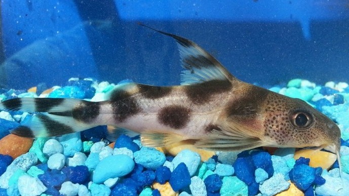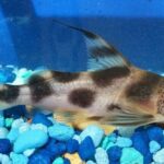 The average adult is 10 inches, as such, it is not recommended for a general community aquarium since it may see smaller fish as prey, however, it is a peaceful species and can be kept with other large fish. Unlike other Synos, this species isn’t territorial and can be kept with conspecifics. The ideal aquarium conditions for these fish are water temperatures ranging from 71.6ºF to 82.4ºF, plenty of rocks, caves, driftwood, sections of pipes and floating vegetation, the more hiding places, the better. The aquarium should also be dimly lit and have a soft substrate. This Synodontis has a creamy white base color with large black spots and has a long extension of the dorsal fin which can reach as far back as its caudal fin.