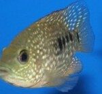 As juveniles these fish are pearly gray with white dots all over the body and fins and two black spots, one in the center of the body and the other on the base of the tail fin. Adults are gold and have white and turquoise spots and 3 black bars and mature males will develop a hump on their foreheads. They can reach up to 12 inches.