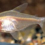 The XRay Pristella Tetra is a peaceful freshwater fish species that is suitable for community aquariums. It has a translucent body with a silver-white coloration and a prominent black bar running horizontally along its body. This bar is what gives the fish its "X-ray" appearance. The fins are clear with a yellowish tint. The average size of this species is around 2 inches (5 cm) in length, making it suitable for small to medium-sized aquariums.