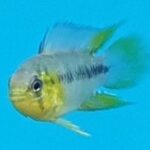 The Yellow Dwarf Cichlid, or Borelli's Dwarf Cichlid, is a small freshwater fish that can grow up to 2.5 inches (6 cm) in length. They are a popular species for aquariums due to their bright and vibrant colors, including yellow and blue. They are relatively peaceful fish and can be kept in small groups in a well-maintained aquarium with plenty of hiding places and a sandy substrate.