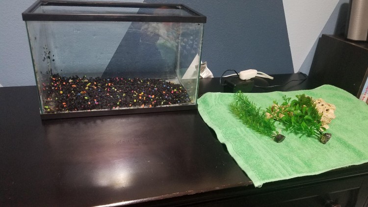 I had an extra 5-gallon tank and some gravel at the house and figured it was the perfect setup for the betta.