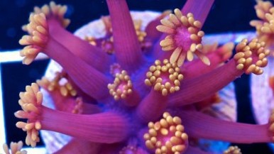 The Pink Sun Goniopora get its primary nutrition from the symbiotic zooxanthellae living within its tissue. But on top of this, we still recommend you do supplemental feeding by adding mysis and brine shrimp. Further, the additional of dissolved organics is highly recommended.