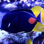 The Achilles Tang is very dark brown to purple. It has bright highlights of white and orange around the dorsal, caudal, and anal fins. A white marking is also present on the gill covers and a striking orange teardrop is found near the caudal fin. The juveniles of this species have an orange marking by the tail in the shape of a streak instead of being teardrop in shape. A large aquarium is necessary to provide plenty of swimming room,and these fishes require strong water flow as they are normally found in surge zones. It is aggressive towards other Tangs and Surgeonfish, but peaceful with other fish.
