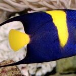 The Asfur Angelfish originating in the Red Sea, but also found in the Indo-Pacific, the Asfur has a dark blue/purple body, black face, yellow tail, and a predominant yellow crescent bisecting the body vertically. Often confused with Pomacanthus maculosus, the Asfur Angelfish has a bright yellow tail. As with some other Pomacanthus, the coloration of the juvenile differs markedly from the adult. A shy fish that does best when not kept with other Asfurs due to territorial behavior, the Asfur Angel requires a large tank with numerous hiding places and live rock for grazing. The Asfur Angelfish is prone to nip at stony and soft corals (sessile invertebrates) and clam mantles, but may be kept with small polyped stony corals and somewhat noxious soft corals.