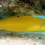 The Banana Wrasse as an adult, it takes on a yellow appearance if female and a blue appearance if male. Both sexes have facial markings in green and fine vertical striping along the body. The fins are very colorfully marked. It should reside in a large aquarium, with other aggressive tank mates, such as Tangs, Puffers and small Triggers and Angels. They are active fish and require plenty of rocks for hiding and a tight-fitting lid. It will become territorial and harass any new additions to the community, therefore, it should be added last to the tank. It may eat mantis shrimp and bristleworms. It does not eat corals or live plants.