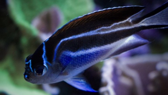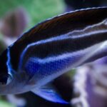 The Bellus Angelfish is one of the few angelfish displaying sexual dimorphism. The male is an iridescent pale white and blue, with the lower half of the body and anal fin highlighted by long, horizontal blue stripes and one, yellow to orange stripe extending toward the caudal fin and edging the dorsal fin. The female is an iridescent pale white and blue and black with a yellow/orange dorsal fin and lateral stripe running from gills to tail. Bellus Angelfish are best housed as a male-female pair or small harem of one male and few females in a large aquarium and are ideal candidates for the deep-water reef aquarium. Acclimation will be facilitated by a dimly-lit tank, but these fishes seem to adapt well to the intense lighting in most modern reef aquariums. The tank should have multiple hiding places and live rock for grazing. Do not keep two males in the same tank as fighting will ensue.