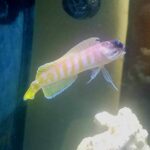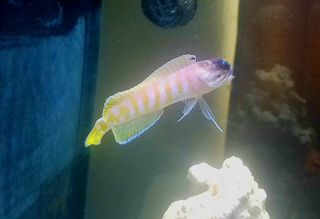 The head and body of the Black Cap Jawfish, are green with faint orange stripes. It has a black spot on the dorsal fin, as well as a black cap on top of the head. It should reside in a medium or larger aquarium with a tight-fitting lid to prevent it from jumping out, and at least 3 inches of mixed substrate for burrowing. It poses a possible threat to small shrimp. The Black Cap Jawfish is hardy and will spawn successfully in an aquarium.