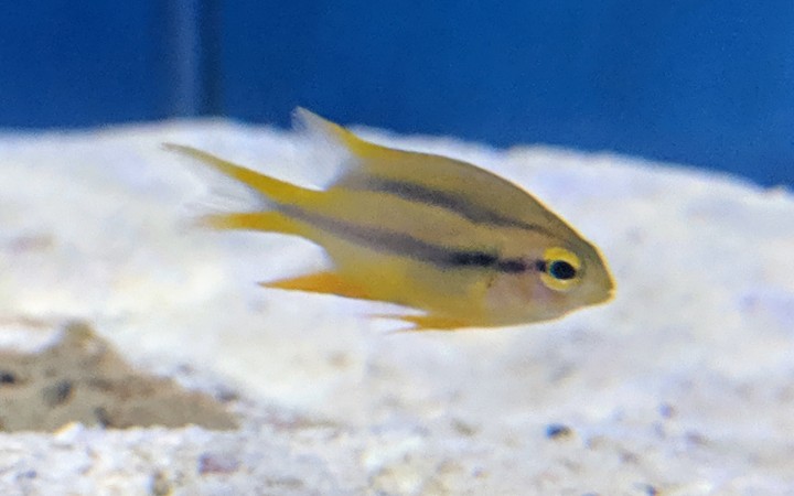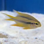 The Blackmouth Bicolor Chromis is an attractive fish as a juvenile, yellow with two horizontal black bars. The fish changes color to brown and black with maturity. As the fish matures, it becomes extremely aggressive towards other fish causing problems in selection of other fish to add to the aquarium.
