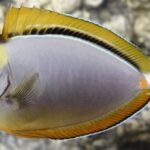 The Blonde Naso Tang darkens with maturity. As a juvenile, it is gray with a yellow stripe on both the dorsal and anal fin. When matured, the body takes on a darker bluish-gray tone and the juvenile striping is supplemented with additional color. The tail takes on a lyre shape and two yellow patches appear at the peduncle spines near the tail. A thin, black mask forms between the eyes and mouth and the lips develop a yellow color. Naso Tangs from Hawaii are often more brightly colored than those found in other areas. A large aquarium is necessary to provide plenty of swimming room, places to hide, and a tight-fitting lid to prevent jumping to escape. It is aggressive towards other tangs but peaceful with other fish in the tank.