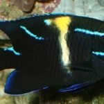The Blue Velvet Damselfish is black with small blue stripes and one large white vertical stripe. As it matures, it may lose some of its coloring fading towards brown and black. It is aggressive toward other fish and prone to disease if proper aquarium management techniques are not practiced.