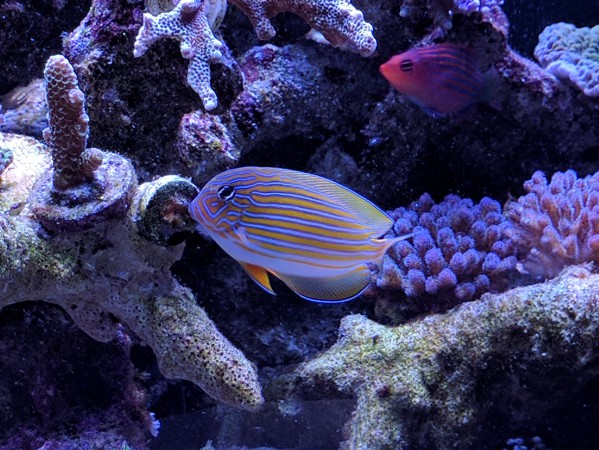"The Clown Tang has horizontal blue striping on a bright yellow to orange background. It also has large peduncle spines. A very large aquarium is necessary to provide plenty of swimming room. It requires very clean, properly oxygenated water. It is aggressive towards other Tangs, Surgeonfish, and fish with similar body shapes or feeding patterns.