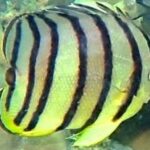 The Eight Banded Butterflyfish (Chaetodon octofasciatus) is a small and colorful species of marine fish belonging to the family Chaetodontidae. It has a distinctive coloration of eight black vertical bands on a white body, with a yellow tail and dorsal fin. The species can reach a maximum size of around 7 inches (18 cm) in the wild and can be kept in aquariums of at least 75 gallons.