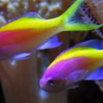 The Evansi Anthias is a small and colorful saltwater fish that can reach a maximum length of 4 inches. It has a slender body with shades of pink, orange, and yellow, and a distinctive black spot behind its pectoral fin. This species is peaceful and can be kept in small to medium-sized aquariums, preferably with plenty of hiding places and a water temperature range of 72-78°F and a pH range of 8.1-8.4.