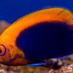 The Flameback Angelfish has striking contrasts of blue and orange-yellow colors. While the body is predominately blue, there is a broad and bright orange to yellow swatch from the head along the back to the tip of the dorsal fin. The caudal fin is yellow and somewhat transparent, which distinguishes it from the Brazilian Flameback Angelfish. On occasion, this fish may nip at SPS and some species of polyp corals in the reef aquarium.