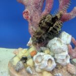 The Fuzzy Dwarf Lionfish it has red, white, and black vertical stripes along the body with large, fan-like pectoral fins and tall, quill-like dorsal fins. The Fuzzy Dwarf Lionfish is appropriately named because of its full fins. A medium sized aquarium with numerous hiding places is suitable. It will hide while acclimating to its new environment. The top spines are venomous, causing reactions similar to a bee sting. The Fuzzy Dwarf Lionfish is a personable fish that quickly recognizes and responds to its owner's presence.