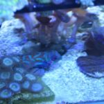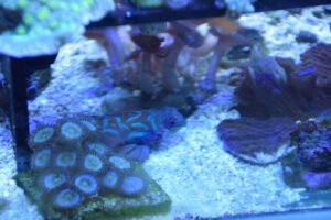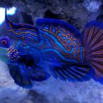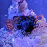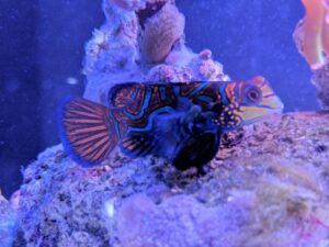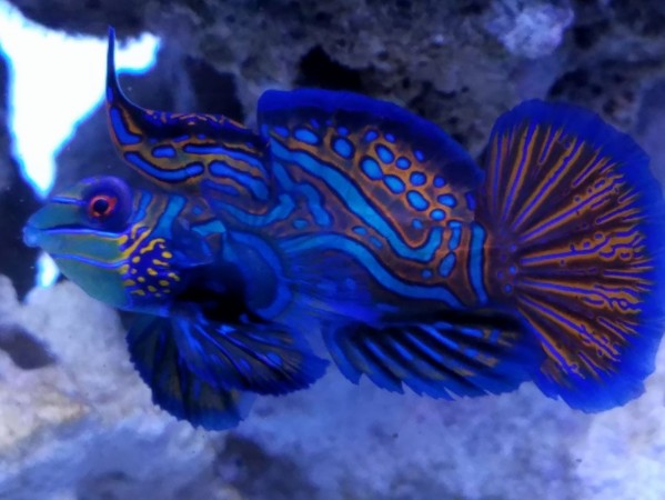 The head and body of the Mandarin have a mazelike combination of blue, orange, and green. Males may be distinguished from females by their more elongated first dorsal spine. It is extremely popular with aquarists because of its unusual beauty. It should be kept in an aquarium with live rock, live sand, and plenty of hiding places. It is moderately hardy in reef aquariums if given special care. It is not overly aggressive towards other fish, except for conspecifics.
