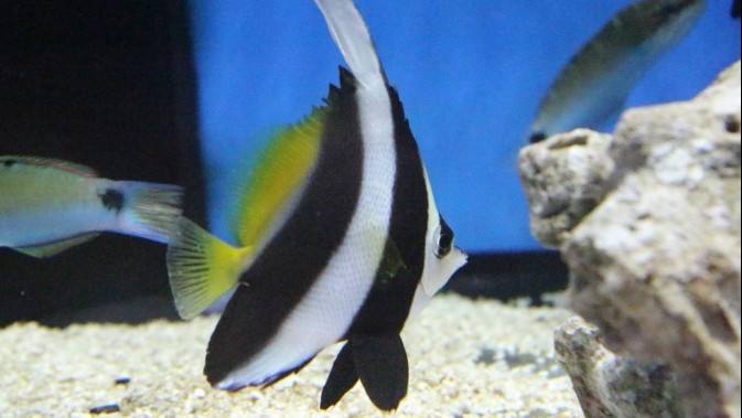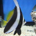 The Masked Bannerfish is a peaceful, hardy fish species that can reach up to 9 inches in length. They have a distinct black mask around their eyes, a white body, and yellow fins. They are active swimmers and need plenty of open swimming space in their aquarium.