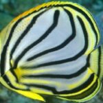 Meyer's Butterflyfish is a small, peaceful, and colorful species that can grow up to 5 inches in length. It has a flat, round body with a black coloration on its back and a yellow-orange coloration on its underside. This species is best kept in a tank of at least 50 gallons with plenty of live rock for hiding and grazing.