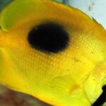 The Mirror Butterflyfish (Chaetodon speculum) is a small saltwater fish found in the tropical waters of the Indo-Pacific region. They can grow up to 20 cm (8 inches) in length and have a deep, compressed body shape with a bright yellow coloration, black markings, and a reflective blue spot on their dorsal fin. They are commonly found in shallow reefs and lagoons and can be kept in aquariums with appropriate care.