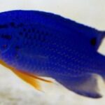 The Orangetail Blue Damselfish is the common name for the male Blue Damselfish. The female is all blue; the male has an orange tail. The Blue Damselfish is the Molly of saltwater aquariums. It is a very colorful, hardy, and active fish. In the wild, Blue Damselfish are found throughout reefs, usually busy defending a small territory. The Blue Damselfish has the ability to hide in a hole or crevice and darken to an almost black color. This usually happens when it is threatened. After the perceived threat is gone, it will turn electric blue in a matter of seconds.