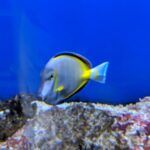 The Powder Brown Tang has a brown body with a white mark on the cheek between the mouth and eyes. The pectoral, anal, and dorsal fins are dark brown with light blue highlights at the tip. The dorsal fin also has an orange stripe present. The tail is blue with a yellow vertical bar. Yellow striping runs along the body, against the anal and dorsal fins, forming a wishbone-shaped marking. A large aquarium is necessary to provide plenty of swimming room. It is a very passive fish that will have trouble with other aggressive tangs. Keep only one per tank.