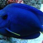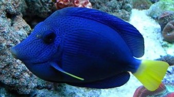 The Purple Tang is blue to purple in color with a yellow tail and yellow accents on the pectoral fins. This fish was formally known only to the coral reefs of the Red Sea, but it is now found in the Arabian Sea, the Gulf of Aden and in the waters off Sri Lanka as well. It usually lives singly, but can occasionally be found in schools in the southern Red Sea. Adults can reach a size of 10 inches. The Purple Tang is one of the most prized specimens of all saltwater fish for its coloration, and one of the most popular Tangs for the reef aquarium. If housed properly, it is a rewarding and attractive addition to any large fish-only tank or reef aquarium. If keeping them, be sure to provide good lighting, lots of free-swimming space and plenty of potential hiding spots. They can be very aggressive and do not fare well with tank mates of similar body shape, especially other Tangs of the genus Zebrasoma.