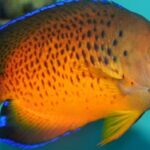 The Rusty Angelfish is aptly named for its predominate red or amber coloration punctuated with black dots that decrease in size from dorsal to anal and pelvic fins. The anal fin is dark and both the dorsal and anal fins are rimmed in bright, sapphire-blue.