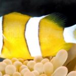 The Three-Band Clownfish body is yellow-orange as well as the snout, belly, and pelvic and anal fins, tending to dark brown or black at the tail. They can grow to lengths of 5.1 in (13 cm) long.