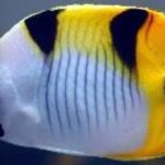 The True Falcula Butterflyfish (Chaetodon falcula) is a species of marine fish found in the western and central Pacific Ocean, particularly in the Great Barrier Reef, Indonesia, the Philippines, and other areas in the region. The fish is named for its sickle-shaped body, which is white with black lines on its back, yellow on its fins, and a black spot on the top of its head. It can grow up to 20 centimeters in length and is typically found in lagoons and coral reefs.