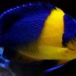 Venusta angelfish are somewhat rare dwarf angelfish that has a yellow body and face area, with a triangular blue patch on top of the head, and a blue colored saddle area that starts near the front dorsal fin and extends overs the rear portion of the body and caudal fin. Anal and pelvic fins are edged in blue. These angelfishes are usually found to inhabit steep outer coral and rocky reef slopes from 20 to over 130 feet (6 – 40 m) in depth. Usually observed singly, almost always upside down in reef caves.