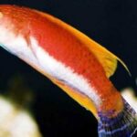 The Whip Fin Fairy Wrasse, originates from the waters of the Indian Ocean. Theis species is a very distinctive wrasse with its long dorsal fin that may exceed the length of the fish. The main body of this wrasse is a brilliant red color while the lower half of the body is white. The dorsal fin is brightly colored yellow and is outlined in blue. The male during courting will display its brilliantly colored fins in an attempt to persuade its mate. Colors may vary depending on the fish's mood. The Whip Fin Wrasse is a peaceful, active fish that will bring both color and plenty of activity to a fish-only or reef aquarium. They are typically house in a medium sized tank or larger. When maintained with other Cirrhilabrus or Paracheilinus wrasse, they can become territorial, and dominate similar species. Whip Fin Fairy Wrasse will not harm any corals or invertebrates making them a perfect fish for the reef aquarium. These wrasses like to jump, so a tight fitting canopy is recommended.