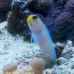 The Yellowhead Jawfish has a yellow head and a light blue-green body. It inhabits the sandy, rubble-strewn areas on the reefs of the tropical Western Atlantic, and is found in close proximity to its burrow or cave. The Yellowhead Jawfish can attain a length of 5 inches in the wild, and up to 4 inches in an aquarium. The Yellowhead Jawfish is a cute fish with a great personality. They are playful and like to people watch. The Yellowhead Jawfish is moderately hardy. It tends to be shy and is best kept with other docile fish. It will not bother other tank inhabitants, but other burrowing fish may bully it. It needs to be kept on 5-7 inches of a fine soft substrate such as sand of various particle sizes. Known for being a jumper when startled or frightened, the tank should have a tight-fitting lid. This fish will spend much of its time in its burrow and when it does venture out, if it is startled, it will bolt back into its burrow tail first with lightning speed. As long as the tank is large enough, several can be kept in the same tank. Multiple specimens provide very interesting behavior as they dance up and down in the burrow. Supply various size rocks among the soft substrate to help reinforce the burrows against them; rockpiles are ideal.