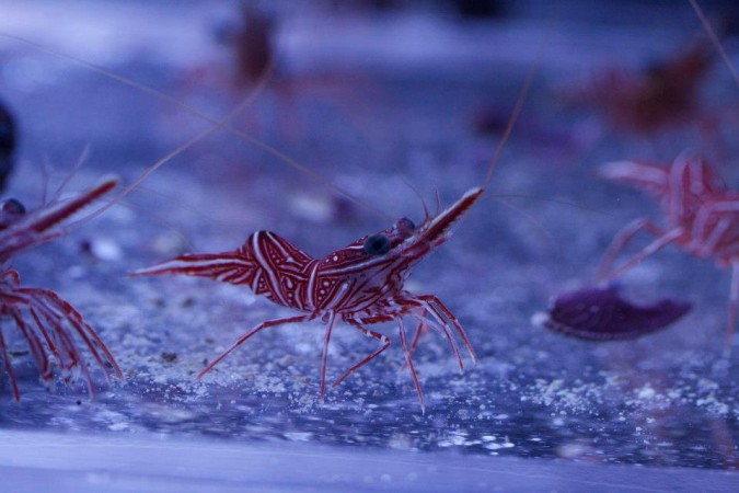 The Camel Shrimp is also commonly referred to as the Hinge-beak Shrimp, Dancing Shrimp, or Candy Shrimp within the aquarium trade. The Camel Shrimp is distinguished by a movable rostrum (beak) that is usually angled upwards. The Camel Shrimp has a variable pattern of red and white stripes on its body with claws located directly in front of its body. The males of its species tend to have larger chelipeds (claws) than the females.
