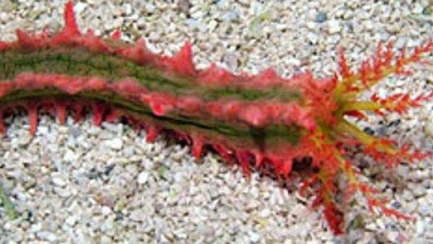 The Pink and Green Sea Cucumber is a colorful filter feeder for home reef aquariums over 30 gallons. Rows of pink knobby thorns run lengthwise along its green and yellow body. Like Sea Apples, striking yellow and pink tentacles extend during feeding. Unlike most other sea cucumbers this animal normally stays stationary, when it finds a suitable location in the aquarium with the proper flow. This species of Sea Cucumber feed by pulling small particulates from the water column, which stick to the hair-like appendages off of its plume. The particulates are then moved to the mouth and ingested. Like other Sea Cucumbers, Pentacta anceps has the potential to poison an aquarium. The Pink and Green Sea Cucumber cannot tolerate high nitrate levels or copper-based medications.